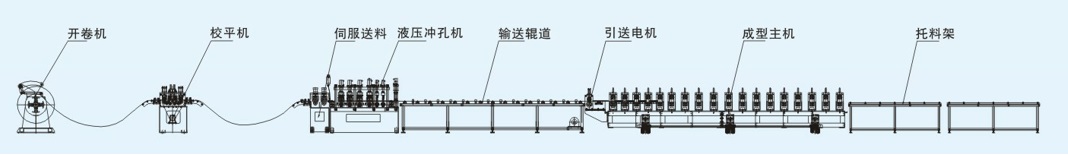 TF光伏支架C型鋼冷彎生產(chǎn)線由開卷機、校平機、伺服送料機、沖孔機、輸送導(dǎo)道、成型主機、托料架組成。