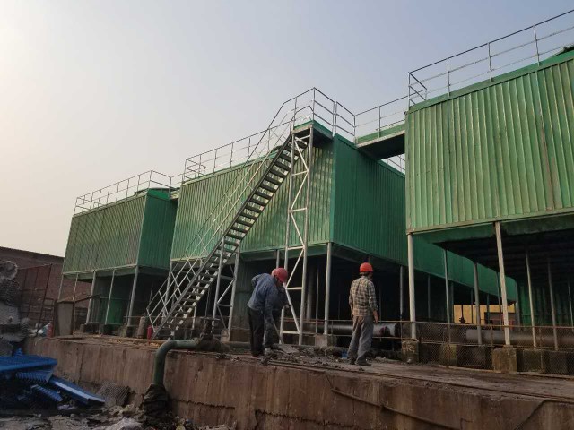 橫流式冷卻塔:是指冷卻熱水從上向下穿過填料,而空氣從水平、斜方向流動(dòng)穿過填料,熱水和空氣的流動(dòng)方向呈近乎900的一種冷卻塔(也有些廠家稱為直交式冷卻塔)。